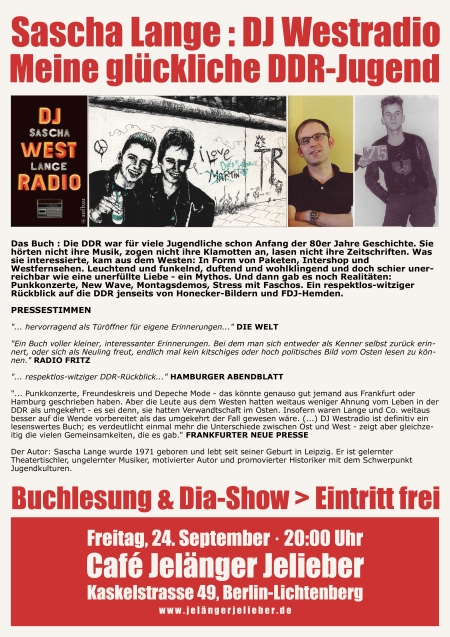 “… Punkkonzerte, Freundeskreis und Depeche Mode – das könnte genauso gut jemand aus Frankfurt oder Hamburg geschrieben haben. Aber die Leute aus dem Westen hatten weitaus weniger Ahnung vom Leben in der DDR als umgekehrt – es sei denn, sie hatten Verwandtschaft im Osten. Insofern waren Lange und Co. weitaus besser auf die Wende vorbereitet als das umgekehrt der Fall gewesen wäre. (…) DJ Westradio ist definitiv ein lesenswertes Buch; es verdeutlicht einmal mehr die Unterschiede zwischen Ost und West – zeigt aber gleichzeitig die vielen Gemeinsamkeiten, die es gab.” Frankfurter Neue Presse 28.04.2007
